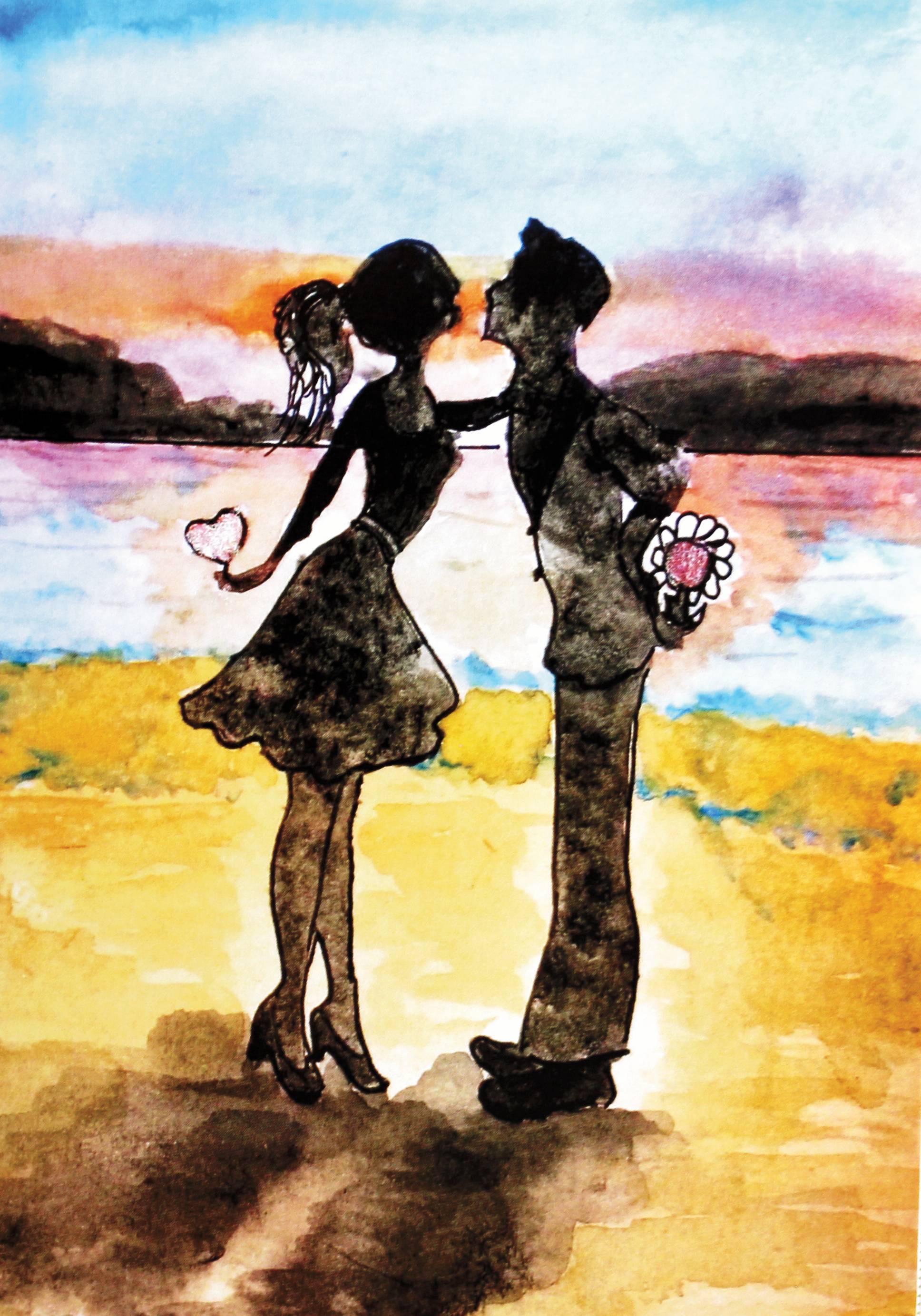 Watercolor Art. A luminous watercolor portraying a woman in a red dress moving through the rain toward a warm inviting light.